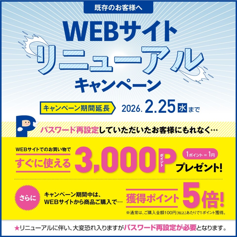 【会員のお客様へ】パスワード再設定で3000Pプレゼント+獲得ポイント5倍 <2026.2.25まで期間延長>