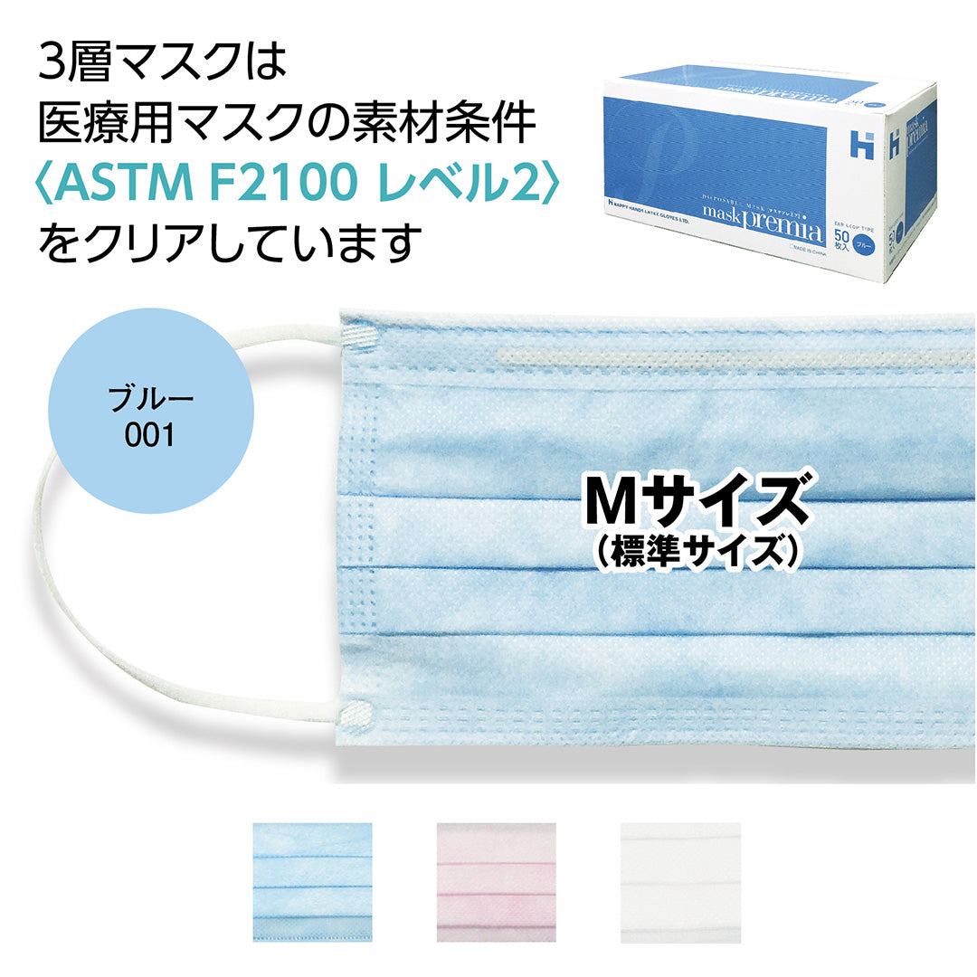 - ☆プレミアシリーズ☆医療用マスクの素材条件(ASTM F2100 レベル2をクリア) 直接顔に接触する内側の層を不織布ではなく、スムーズな上質紙を使用。 内側にはズレや眼鏡の曇りを防ぐスポンジ付き (スポンジの色はブルーです) ■平ゴムタイプ(ノンラテックス) ■ 鼻の形に合わせられるノーズピース付 ■ BFE細菌:細菌ろ過効率≧98%(3.0μm) ■ PFE細菌:微粒子ろ過効率≧98%(0.10μm) ■ サイズ:90mm×175mm(Mサイズ・レギュラー) ※10箱/ケースです ※ロットにより、若干色が異なる場合がございます