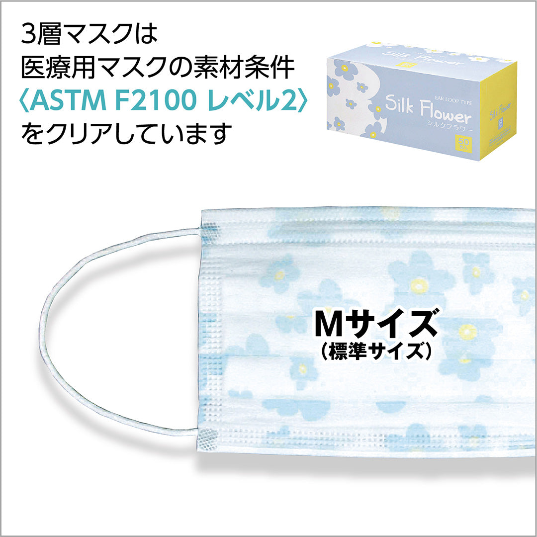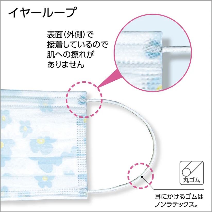 - 内側は混紡不織布使用でシルキータッチ。 通気性も抜群! 肌触りがよく呼吸もしやすい。 かわいい花柄の3層式マスク。医療用マスクの素材条件(ASTM F2100 レベル2をクリア) ■ 丸ゴムタイプ(ノンラテックス) ■ 鼻の形に合わせられるノーズピース付 ■ BFE細菌:細菌ろ過効率≧98%(3.0μm) ■ PFE細菌:微粒子ろ過効率≧98%(0.10μm) ■ サイズ:90mm×175mm(Mサイズ・レギュラー) ※10箱/ケースです ※ロットにより、若干色が異なる場合がございます
