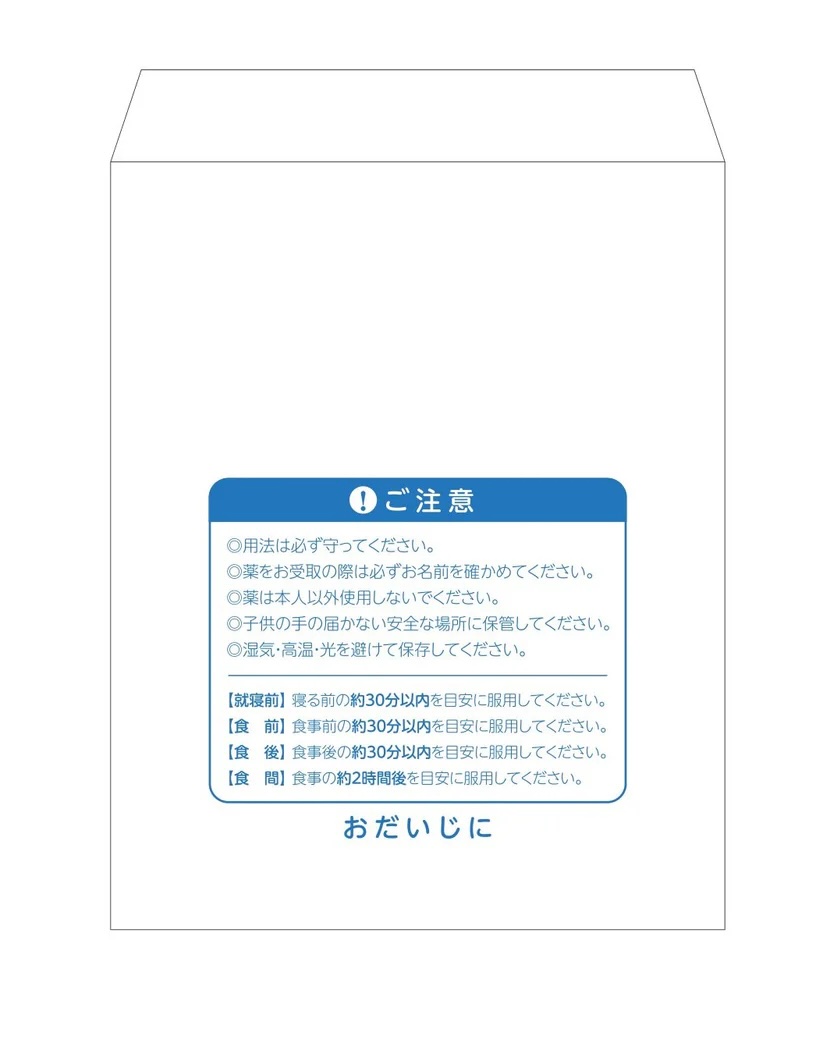 - 患者様へのお薬袋 内服/とんぷく/外用 ≪共通≫ ■ 内服・とんぷく・内服薬にチェックを入れるタイプ ■ サイズ:140mm×100mm(フタ折返部分15mm) ■ 入数:100枚/袋 ■ 日本製 ※こちらの商品は名入れ対応可能です 詳細はカタログまたは当社スタッフまでお問い合わせください ご注文・お問い合わせはお電話・FAXにて承ります (最低ご発注数量・別途印刷代金がかかります)